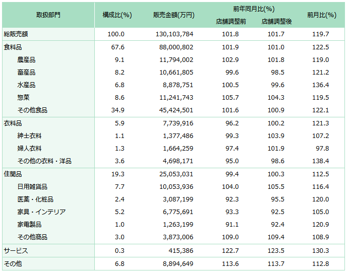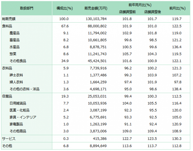 食料品は8800億円の前年同月比で122.5%と伸長。既存店も101.0%の増収だった。