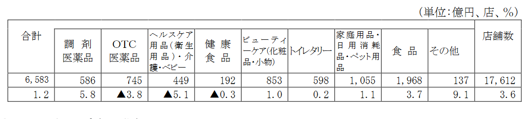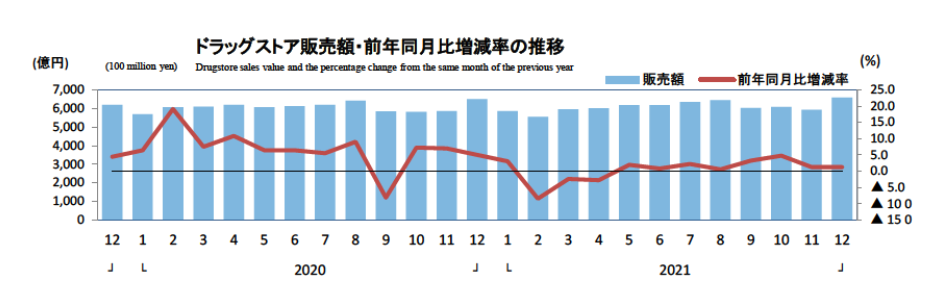 12月ドラッグストア統計|6583億円1.2%増/2021年販売額は7兆3120億円