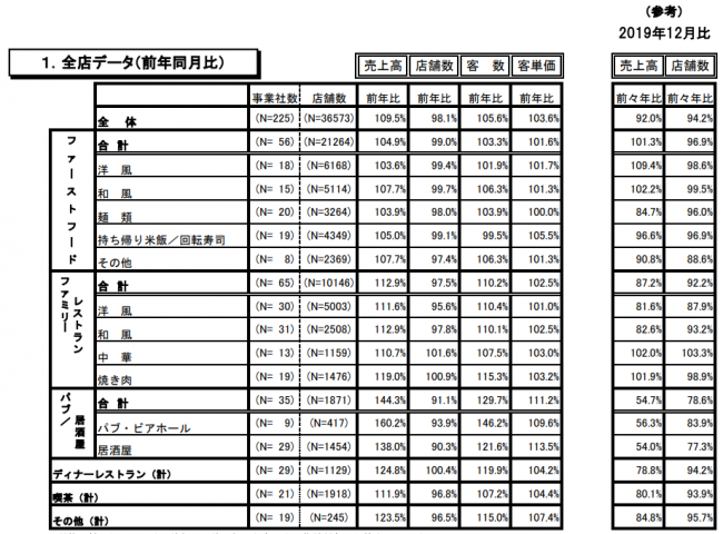 12月外食統計|営業制限解除で前年同月比109.5%/年間では前年比98.6%