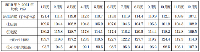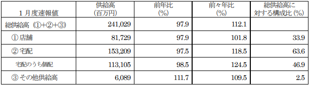 1月度は総供給高(総売上高)が2410億2900万円で、前年比は97.9%で前年割れとなったものの、2019年比では112.1%と大きく伸長している。店舗の供給高は817億2900万円で97.9%(2019年比101.8%)。部門別では、惣菜が好調に推移した。
