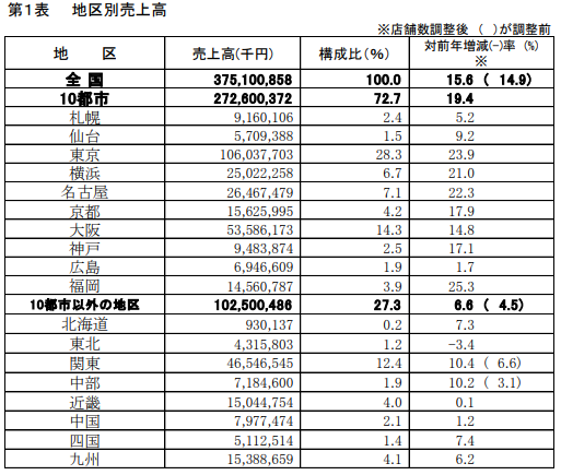 地区別では、大都市が全地区で前年を超えて19.4%増と、3カ月連続の二桁増となった。地方は6.6%増だったが、大都市との差は12.8ポイントと、前月よりさらにその差は拡がった。