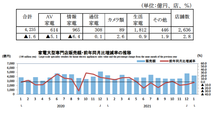 経済産業省が発表した商業動態統計によれば、家電大型専門店の販売額は4235億円、前年同月比1.6%減。店舗数は2636店舗で2.8%増。