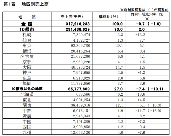 地区別では、大都市の東京、名古屋、京都、大阪、福岡5地区で前年を超えて2.0%増と、5カ月連続でプラス。地方は7.4%減で、全地区で前年割れとなった。