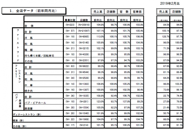 2月外食統計|全体売上げは前年同月比104.8%も19年比では84.5%