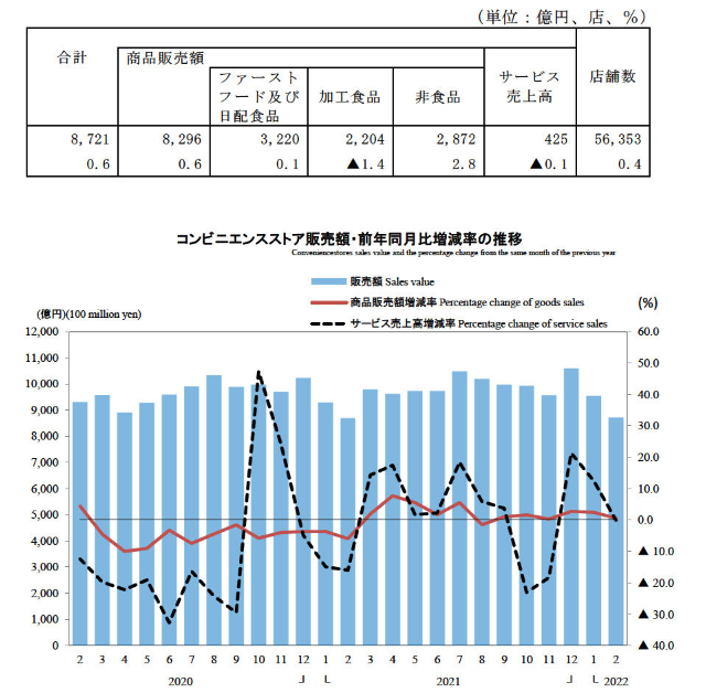 2月のコンビニエンスストアの商品販売額およびサービス売上高は8721億円で前年同月比0.6%の増加。商品別にみると、ファーストおよび日配食品が3220億円(0.1%増)、加工食品が2204億円(1.4%減)、非食品が2873億円(2.8%増)となり、商品販売額は8296億円(0.6%増)。サービス売上高は425億円(0.1%減)。