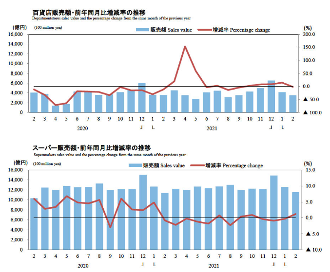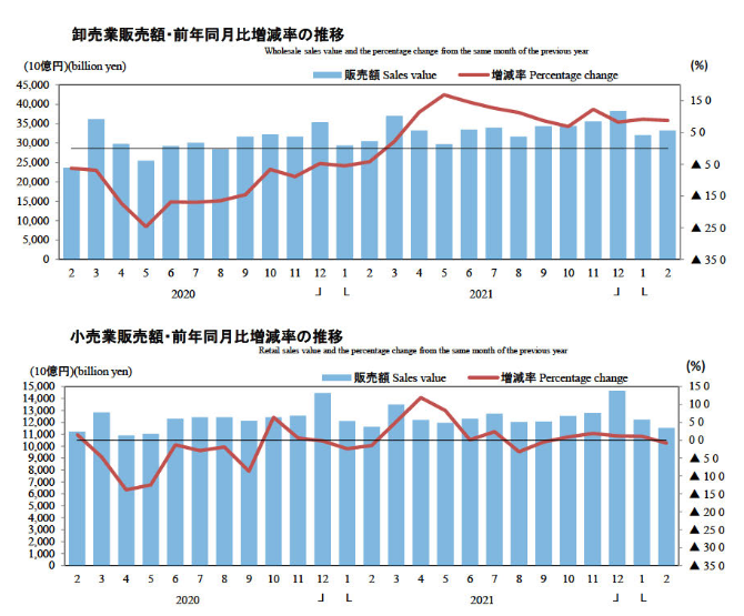 2月商業動態統計|商業販売額44.7兆円6.2%増/小売業販売額11.5兆円