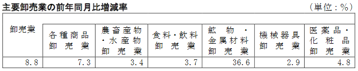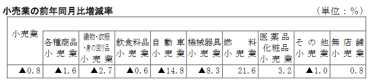 小売業を業種別にみると、織物・衣服・身の回り品小売業が2.7%減、各種商品小売業(百貨店など)が1.6%減、飲食料品小売業が0.6%減と前年同月を下回った。一方で、ガソリンの高騰が続く燃料小売業が21.6%を大きく増加。また医薬品・化粧品小売業が3.2%増、無店舗小売業が0.8%増となっている。