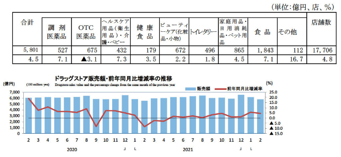 商業動態統計によれば2月のドラッグストア販売額は5801億円、前年同月比4.5%増。ドラッグストアは好調が続く。店舗数は1万7706店と前年同月比4.8%の増加だ。