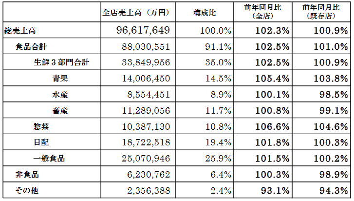 惣菜は1038億7130万円106.6%、日配は1872億2518万円101.8%、一般食品は2507億0946万円101.5%と、食品は堅調だった。