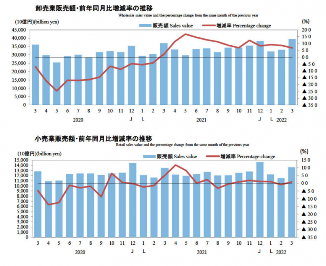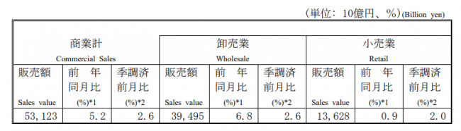 3月の商業販売額は53兆1230億円、前年同月比5.2%の増加となった。内訳は卸売業が39兆4950億円(6.8%増)、小売業は13兆6280億円(0.9%増)。なお、商業販売額の季節調整済(季節、曜日・祝祭日・月の長さの要因を調整したもの)前月比は2.6%増、卸売業は2.6%増、小売業は2.0%増だった。