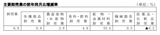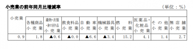 小売業を業種別にみると、自動車小売業が6.6%減、機械器具小売業が3.4%減、織物・衣服・身の回り品小売業が0.6%減、飲食料品小売業が0.0%の横ばいとなった。一方で、ガソリンの高騰が続く燃料小売業が15.2%増、医薬品・化粧品小売業が4.1%増、無店舗小売業が2.7%増、各種商品小売業(百貨店など)が1.8%増となっている。
