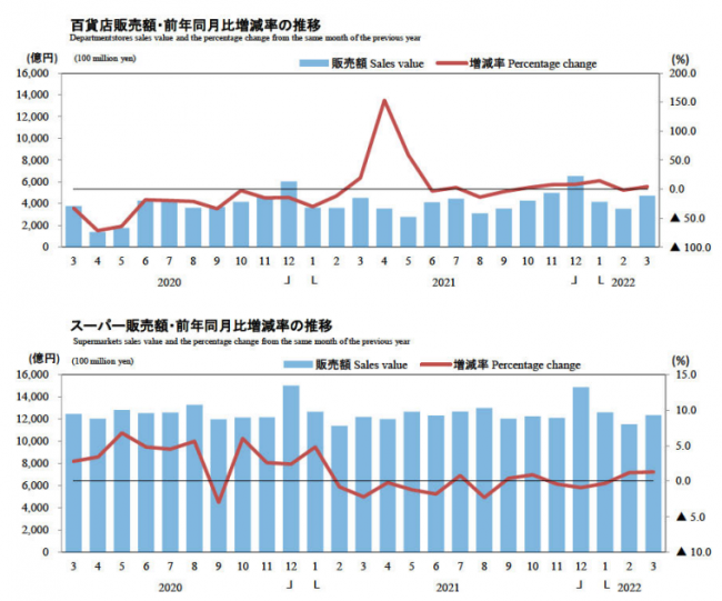 商品別では、衣料品が2.6%の増加、飲食料品は2.2%の増加となった。なお、百貨店・スーパーの季節調整済前月比は、2.3%上昇して、百貨店は8.5%の上昇、スーパーは0.6%の低下となった。