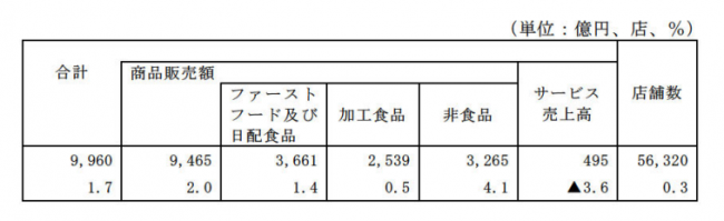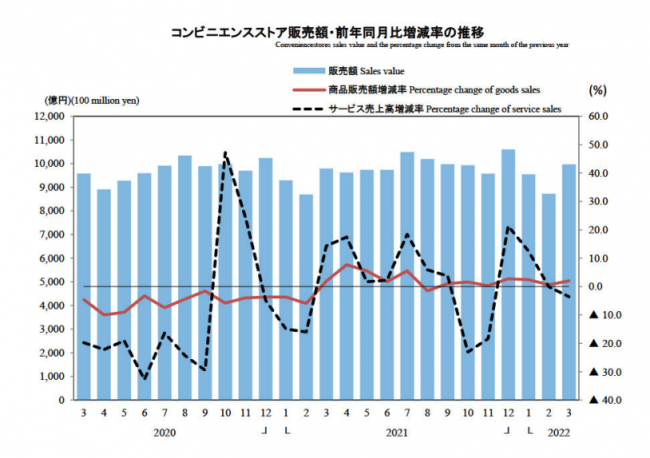 3月のコンビニエンスストアの商品販売額およびサービス売上高は9960億円で前年同月比1.7%の増加。商品別にみると、ファーストフードおよび日配食品が3661億円(1.4%増)、加工食品が2539億円(0.5%増)、非食品が3265億円(4.1%増)となり、商品販売額は9465億円(2.0%増)。サービス売上高は495億円(3.6%減)。