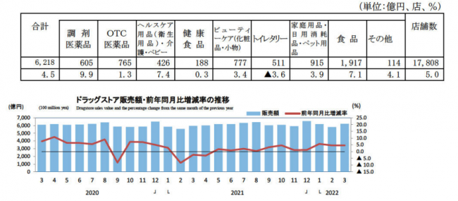 商業動態統計によれば3月のドラッグストア販売額は6218億円、前年同月比4.5%増。ドラッグストアは好調が続く。店舗数は1万7808店と前年同月比5.0%の増加だ。