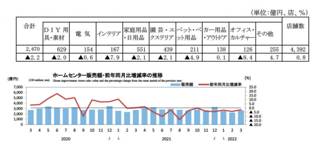 それによれば3月のホームセンター販売額は2670億円、前年同月比2.2%減だった。店舗数は4392店で前年比0.8%の伸長。