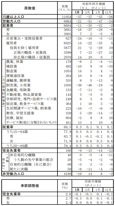 3月労働力調査|就業者数6684万人、完全失業者数は9カ月連続で減少