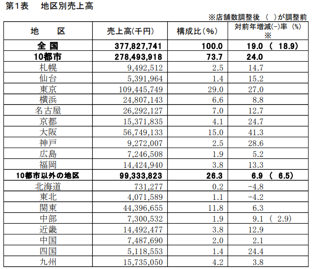 地区別では、大都市全10地区で前年を超えて24.0%増と伸長した。とくに東京が27.0%増、大阪が41.3%増で好調だった。地方は北海道と東北を除く6地区で前年を上回り、6.9%増とプラスに転じた。