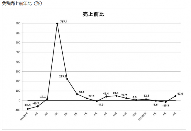 (一社)日本百貨店協会(東京都中央区、村田善郎会長)のインバウンド推進委員会が2022年4月の「外国人観光客の売上高・来店動向」を発表した。調査はインバウンド推進委員店の88店舗が対象となっている。