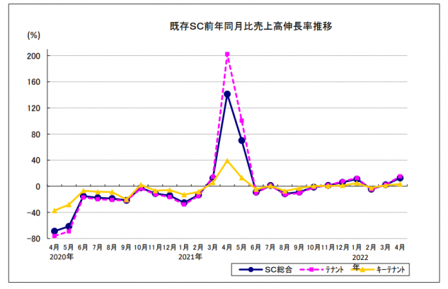 (一社)日本ショッピングセンター協会(東京都文京区、清野智会長)が5月25日(水)、2022年4月の「SC販売統計調査」を発表した。既存SC売上高は前年同月比プラス12.6%と、行動制限緩和により来館者数が前年を大きく上回った。