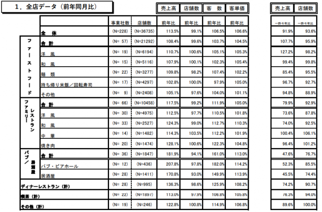 4月外食統計|全体売上げは前年同月比113.5%も19年比では91.9%