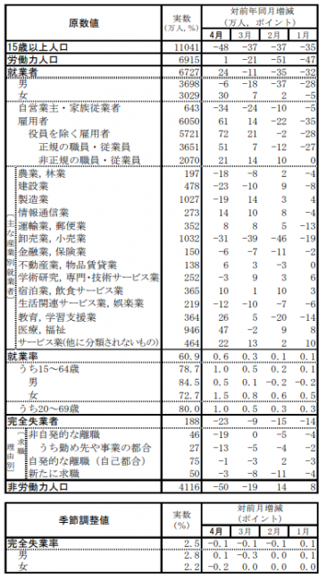 4月労働力調査|就業者数6727万人、完全失業者数は10カ月連続で減少