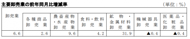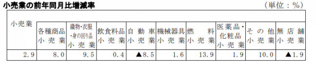 小売業を業種別にみると、自動車小売業が8.5%減、無店舗小売業が1.9%減、一方で、ガソリンの高騰が続く燃料小売業が13.9%増、織物・衣服・身の回り品小売業が9.5%増、各種商品小売業(百貨店など)が8.0%増、医薬品・化粧品小売業が1.9%増、機械器具小売業が1.6%増、飲食料品小売業が0.4%増となっている。