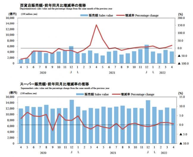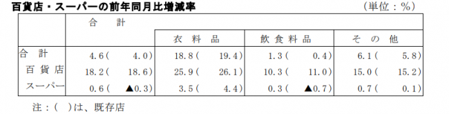 商品別では、衣料品が18.8%の増加、飲食料品は1.3%の増加となった。なお、百貨店・スーパーの季節調整済前月比は、1.1%上昇して、百貨店は0.1%の上昇、スーパーは1.2%の低下となった。