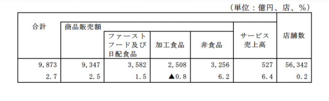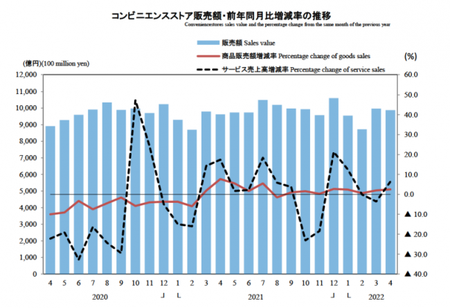 4月のコンビニエンスストアの商品販売額およびサービス売上高は9873億円で前年同月比2.7%の増加。商品別にみると、ファーストフードおよび日配食品が3582億円(1.5%増)、加工食品が2508億円(0.8%減)、非食品が3256億円(6.2%増)となり、商品販売額は9347億円(2.5%増)。サービス売上高は527億円(6.4%増)。