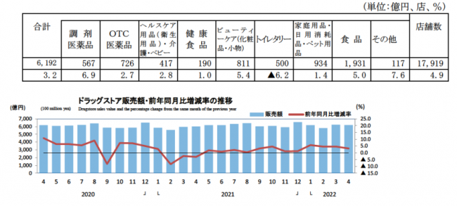 商業動態統計によれば4月のドラッグストア販売額は6192億円、前年同月比3.2%増。ドラッグストアは好調が続く。店舗数は1万7919店と前年同月比4.9%の増加だ。