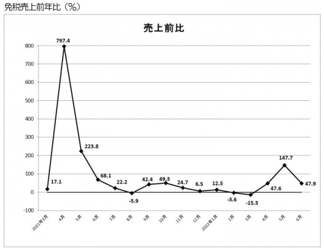 6月の免税総売上高は、約66億円で前年同月比47.9%増となった。売上高の内訳として、一般物品は約59億円で72.1%増加したものの、消耗品は約7億円で33.0%減だった。