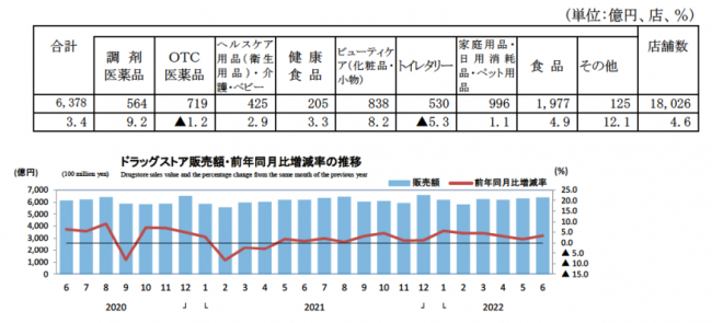 商業動態統計によれば6月のドラッグストア販売額は6378億円、前年同月比3.4%増。店舗数は1万8026店と前年同月比4.6%の増加だ。