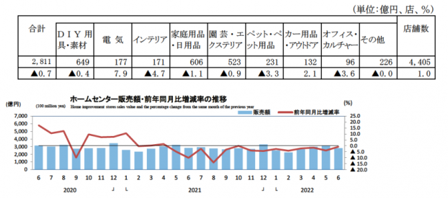 それによれば6月のホームセンター販売額は2811億円、前年同月比0.7%減だった。店舗数は4405店で前年比1.0%の伸長。