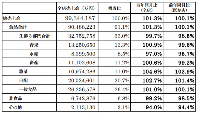 食品の内訳として、生鮮3部門合計は3275億2758万円で99.7%。