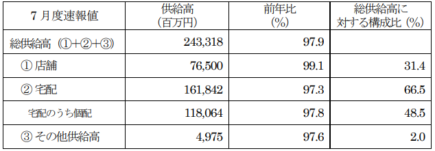 7月度の総供給高は2433億1800万円と前年比97.9%。2カ月連続で前年に届かなかったが、店舗・宅配ともに物価上昇の影響を受け、7月上旬から客単価が上昇傾向となっている。
