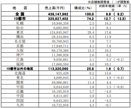 地区別では、大都市はすべて対前年増で12.7%増と二桁増を示した。地方は3地区で前年割れとなったが、合計では1.6%増と前年実績を確保した。