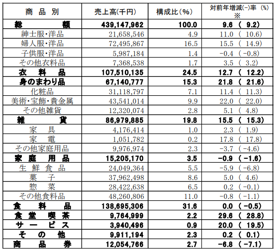 衣料品は、一部店舗で生産調整等によるセール品の在庫が不足したが、プロパー品への需要が高まり、12.7%で二桁増と健闘した。