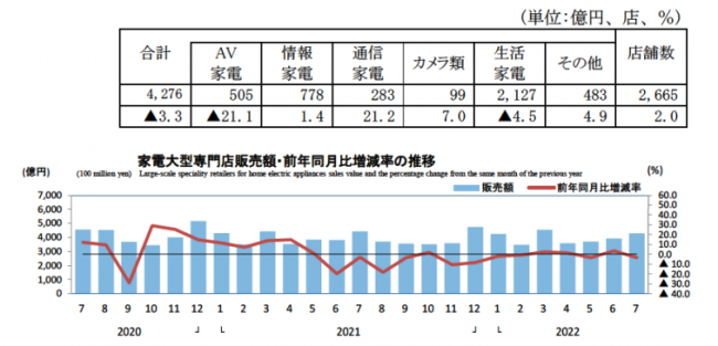 経済産業省が発表した商業動態統計によれば、7月の家電大型専門店の販売額は4276億円、前年同月比3.3%の減少となった。店舗数は2665店舗で2.0%増。
