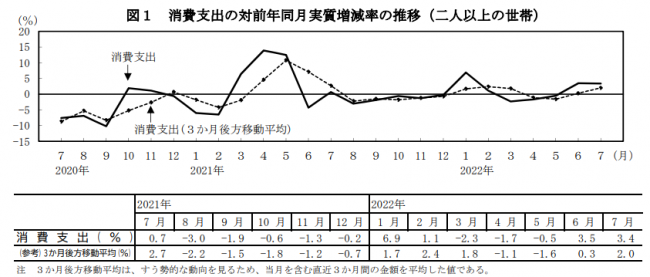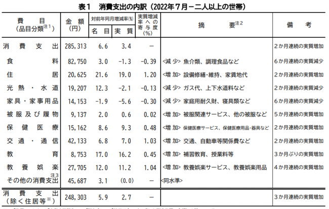 総務省統計局発表の7月の「家計調査報告」によれば、2人以上の世帯の消費支出は28万5313円で、前年同月比は物価変動の影響を除いた「実質」では3.4%の増加、名目6.6%の増加となった。前月比(季節調整値) は実質1.4%の減少。