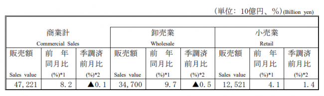 なお、商業販売額の季節調整済(季節、曜日・祝祭日・月の長さの要因を調整したもの)前月比は0.1%の低下、卸売業は0.5%減、小売業は1.4%増だった。