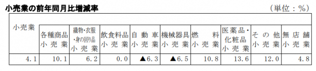 小売業を業種別にみると、医薬品・化粧品小売業が13.6%増、その他小売業が12.0%増、ガソリンの高騰が続く燃料小売業が10.8%増、各種商品小売業(百貨店など)が10.1%増、織物・衣服・身の回り品小売業が6.2%増、無店舗小売業が4.8%増、飲食料品小売業が0.0%、一方で、機械器具小売業が6.5%減、自動車小売業が6.3%減となった。