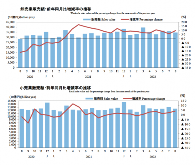 8月の商業販売額は47兆2210億円、前年同月比8.2%の増加となった。内訳は卸売業が34兆7000億円(9.7%増)、小売業は12兆5210億円(4.1%増)。
