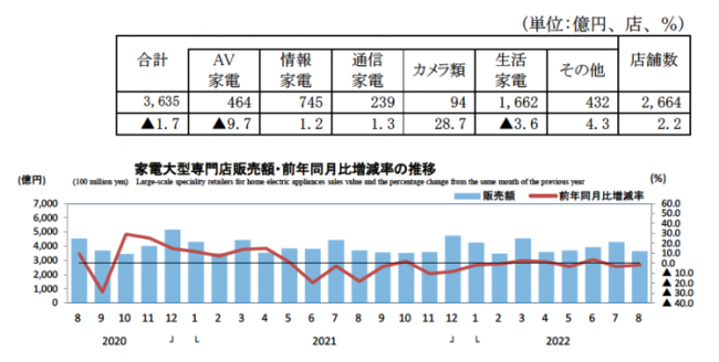 経済産業省が発表した商業動態統計によれば、8月の家電大型専門店の販売額は3635億円、前年同月比1.7%の減少となった。店舗数は2664店舗で2.2%増。