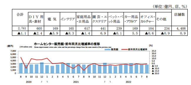 それによれば8月のホームセンター販売額は2741億円、前年同月比1.1%減だった。店舗数は4408店で前年比0.9%の伸長。
