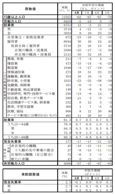 8月労働力調査|就業者数6751万人/卸売業・小売業就業者前年比23万人減少