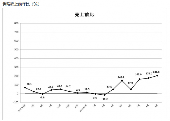 9月の免税総売上高は約91億7000万円(前年同月比204.0%増)。内訳は、一般物品売上高は約82億7000万円(同218.5%増)、消耗品売上高は約9億0000万円(同115.1%増)。