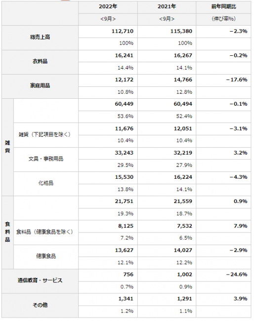 商品別では、「衣料品」が162億4100万円で0.2%減、「家庭用品」が121億7200万円で17.6%減、「雑貨」が604億4900万円で0.1%減、「食料品」が217億5100万円で0.9%増、「通信教育・サービス」が7億5600万円で24.6%減。