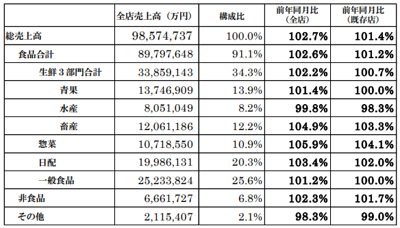 食品合計は8979億7648万円で既存店101.2%。生鮮3部門合計は、3385億9143万円で100.7%だった。