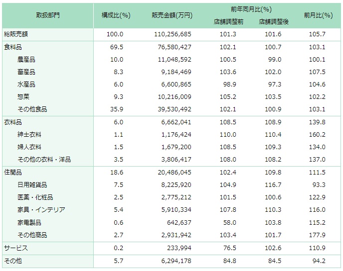 総販売額は1兆1025億6685万円で、既存店前年同月比は101.6%、全店では101.3%だった。