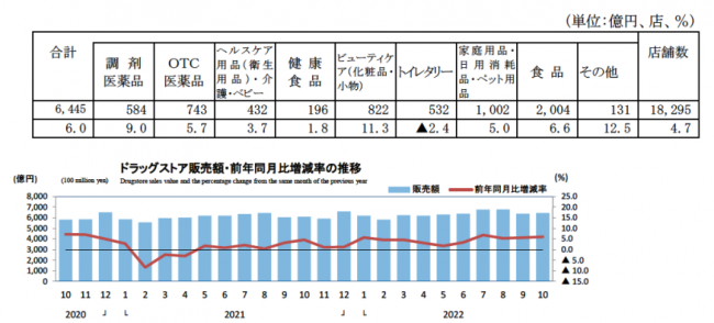 商業動態統計によれば10月のドラッグストア販売額は6445億円、前年同月比6.0%増。店舗数は1万8295店と前年同月比4.7%の増加だ。