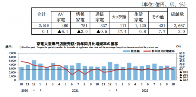 経済産業省が発表した商業動態統計によれば、10月の家電大型専門店の販売額は3516億円、前年同月比0.1%の増加となった。店舗数は2667店舗で2.0%増。